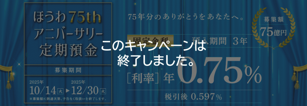 期間:2025年12月30日(火)までおかげさまで設立75周年、長年のご愛顧に感謝を込めた金利上乗せ定期預金です。