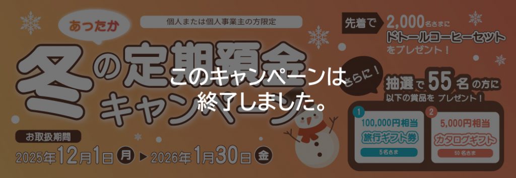 期間:2026年1月30日(金)まで期間中にお預け入れいただいた方に特典をプレセント!