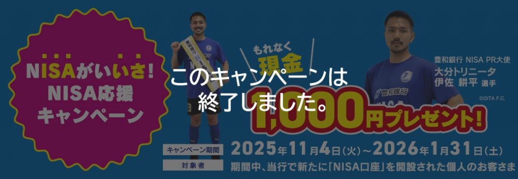 期間:2026年1月31日(土)までNISAをするならほうわがいいさ!豊和銀行NISA PR大使として、大分トリニータ伊佐選手とコラボ中!