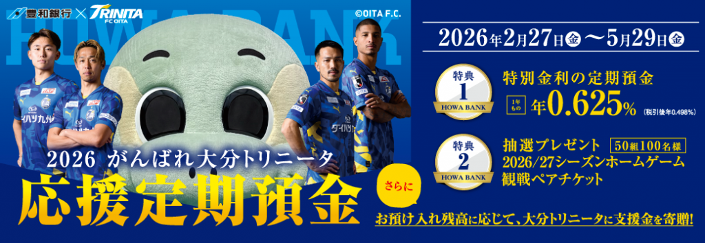 期間:2026年5月29日(金)までお預け入れ残高に応じて、大分トリニータに支援金を寄贈!