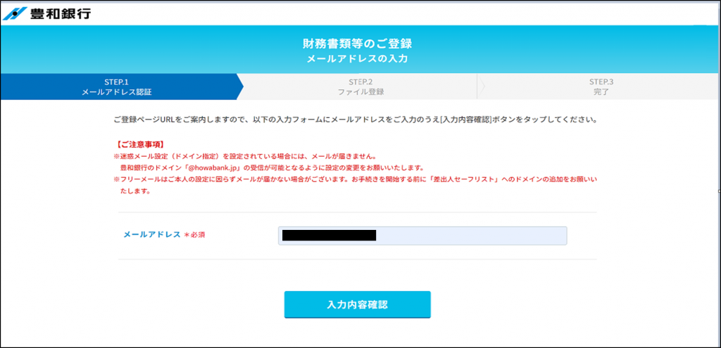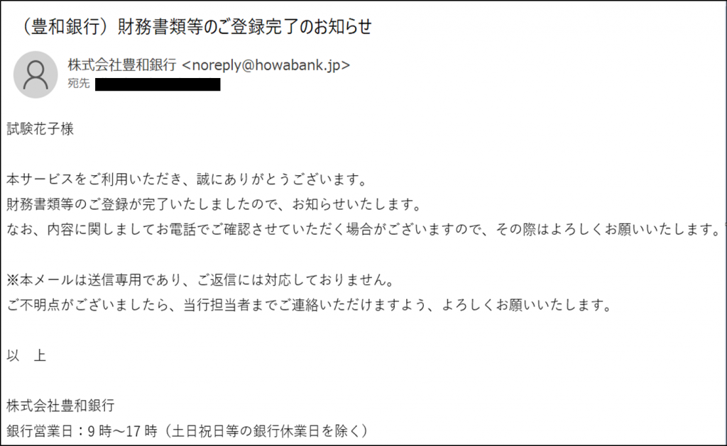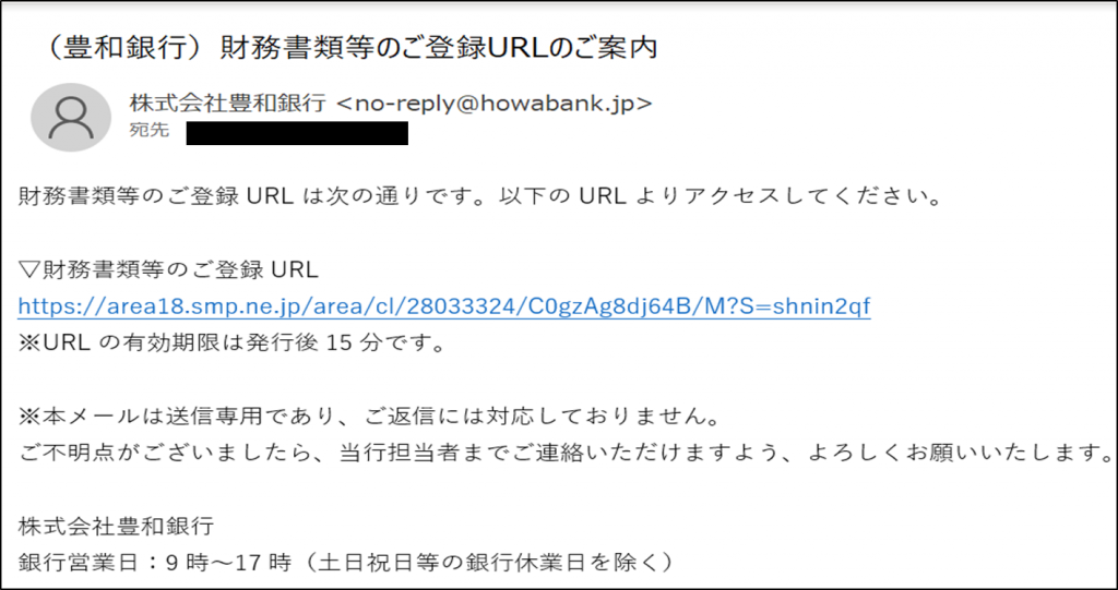 ⑤ ご入力いただいたメールアドレス宛に豊和銀行より下記メールが届きますので、メール本文内記載のURL(財務書類等のご登録URL)をクリックします。