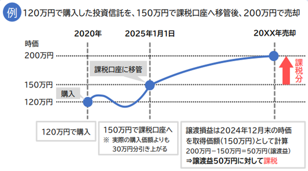 非課税保有期間が終了する年の最終営業日の時価が課税口座における取得価額となり、譲渡時には取得価額をもとに利益に対して課税(損益通算等が可能です)