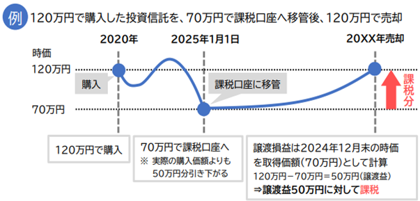- 課税口座(特定口座等)に移管すると、2026年以降の譲渡益・配当等は課税されます。譲渡損失が生じた場合は損益通算が可能となります。